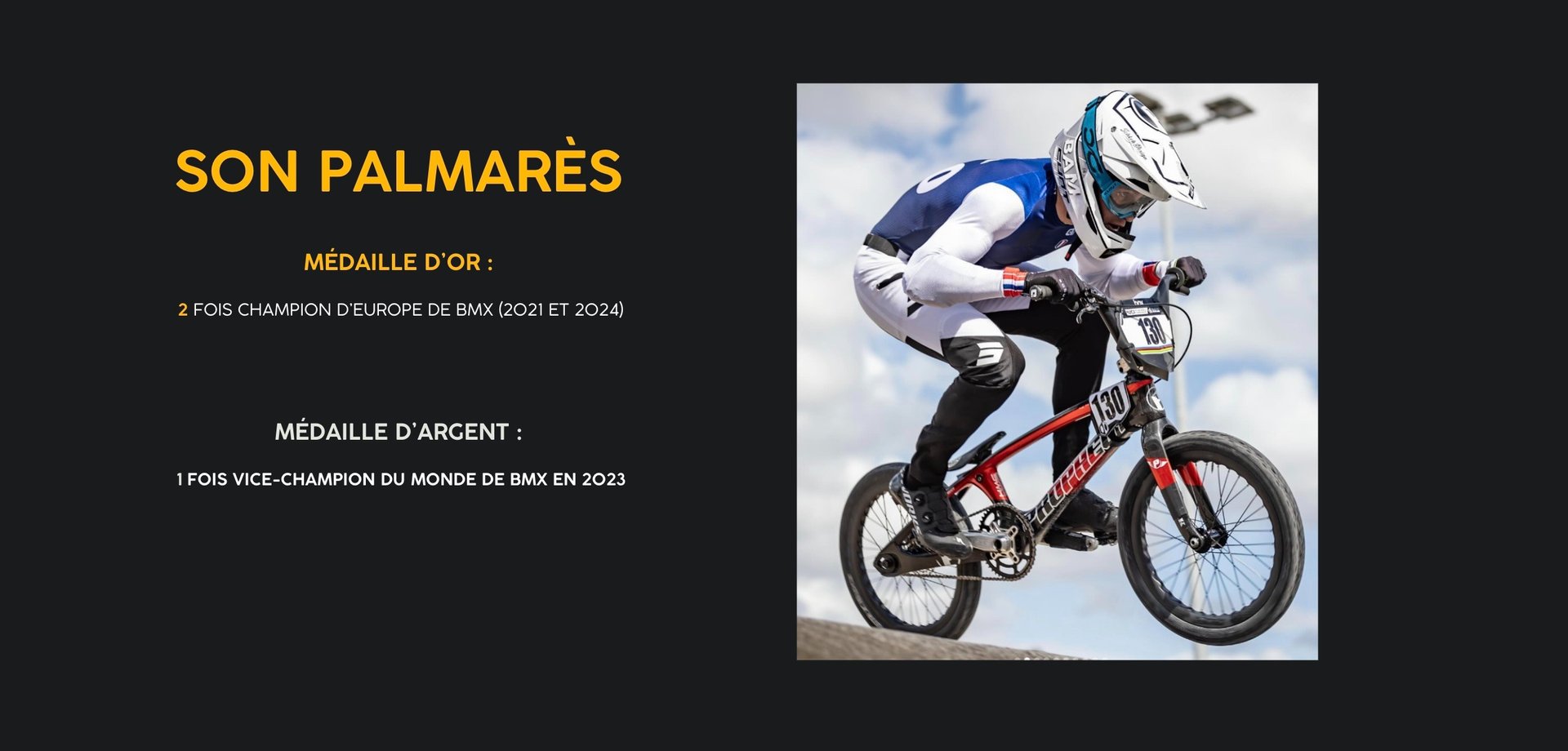 Cependant, plutôt que de se laisser décourager, il a rebondi et est revenu encore plus fort. En 2023, il décroche la médaille d'argent lors des mêmes Championnats du Monde. Ce parcours difficile a porté ses fruits, puisqu'il est également devenu double champion d'Europe de BMX en 2021 et 2024